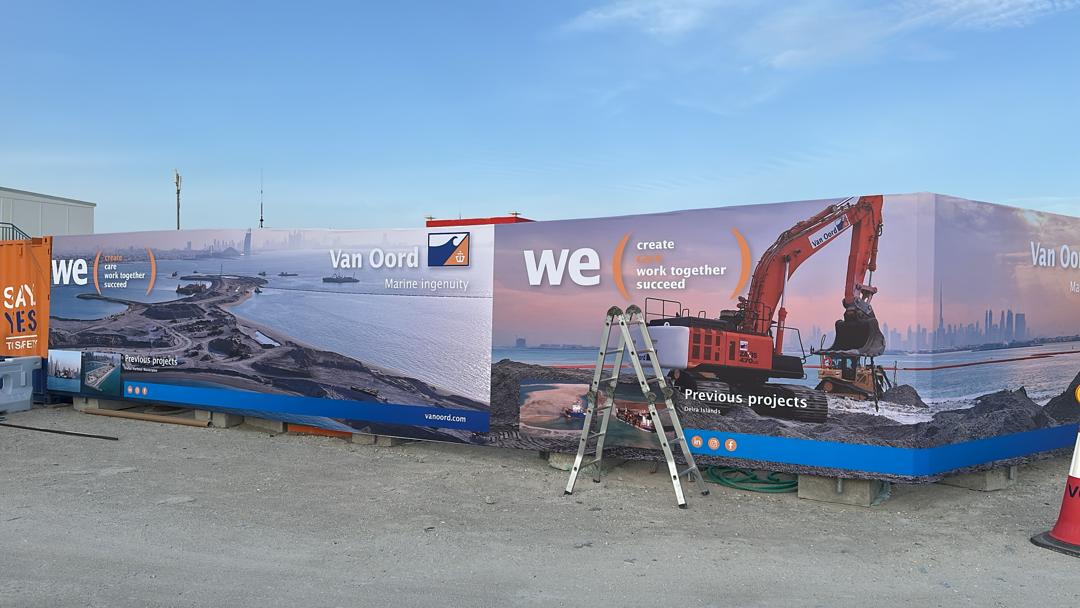 Eco PVC Perimeter Branding Solution for Umm Suqeim Island Reclamation Project Project Story:Installation of Eco PVC Fence with integrated branding panels to enhance site visibility, communication, and perimeter control while